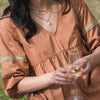 The deep V neckline flatters, while gathered tiers create soft volume without bulk. Golden crochet trim on the sleeves adds a subtle glint, a nod to Glint & Gold’s signature touch of understated luxury. Three-quarter sleeves with gentle elastic cuffs make it perfect for year-round wear, layered or solo.